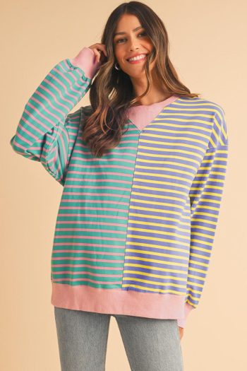 Sky Blue Stripe Colorblock Drop Shoulder Oversize Sweatshirt | Women Sweatshirts & Hoodies