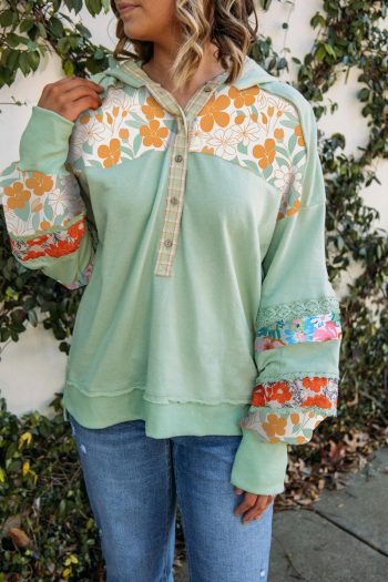 Clearly Aqua Lace Floral Patchwork Hooded Henley Top | Women Long Sleeve Tops