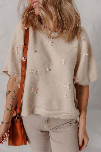 - This Soft Oatmeal Sweater Features Pearl Bow Details For A Touch Of Elegance And Sophistication.