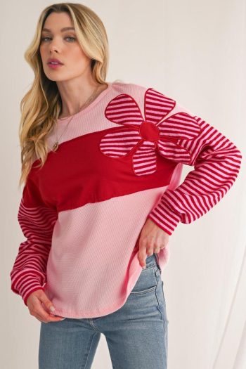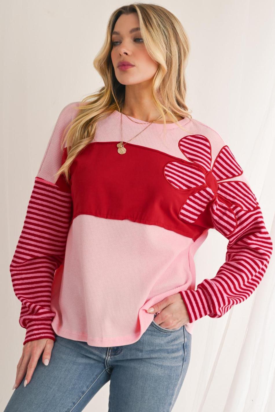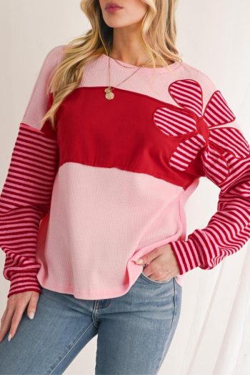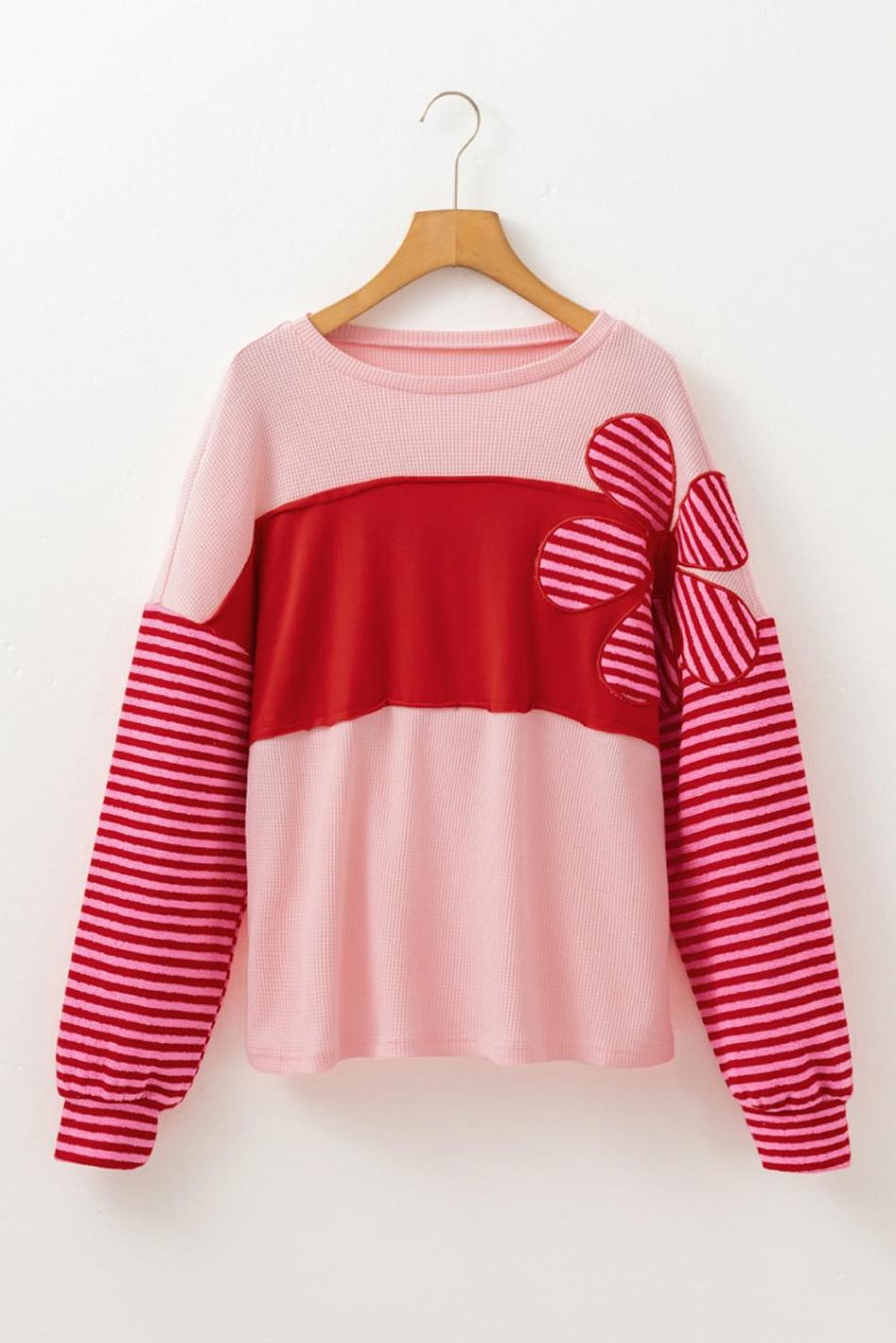 Pink Floral Colorblock Striped Sleeve Waffle Patchwork Top | Women Long Sleeve Tops