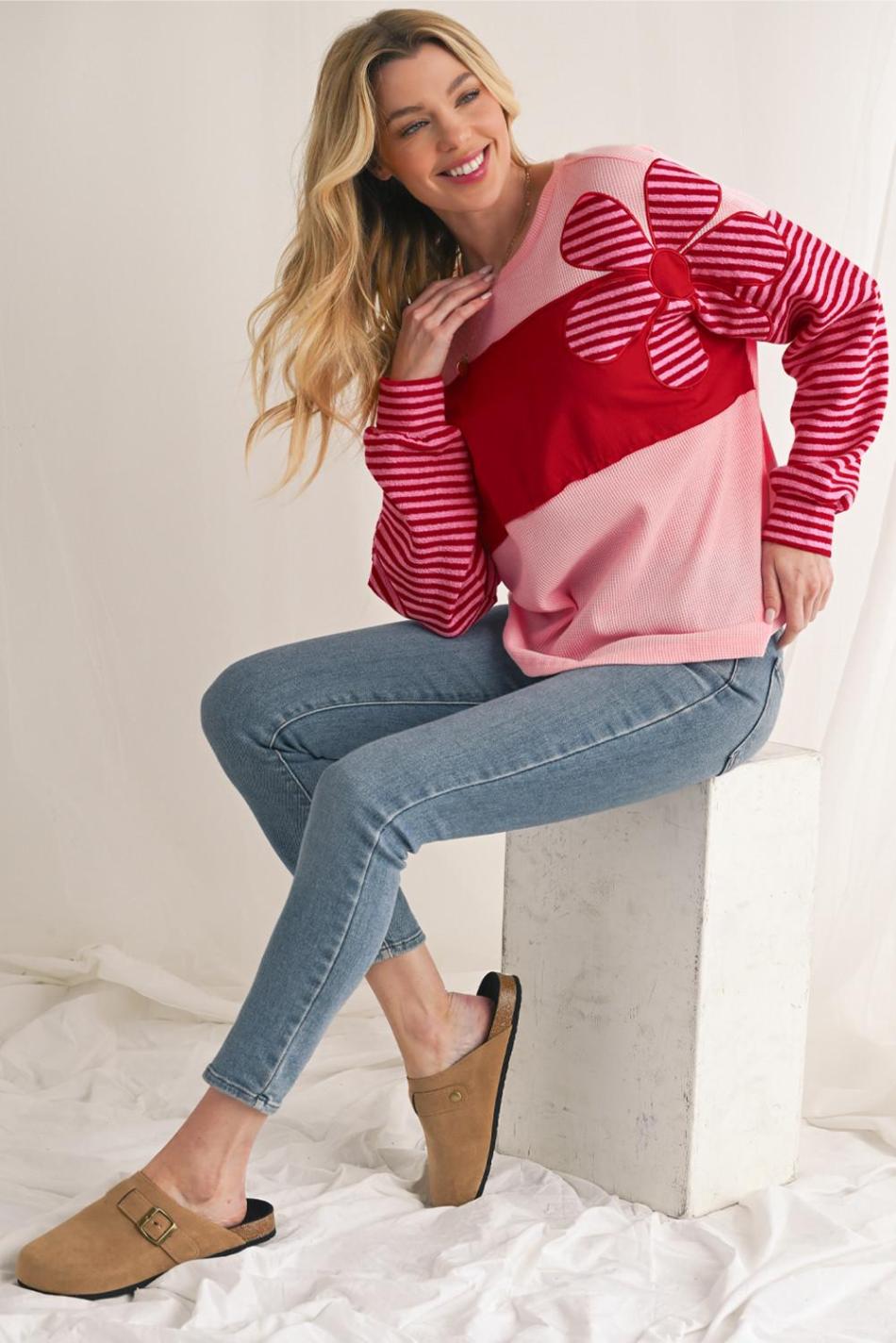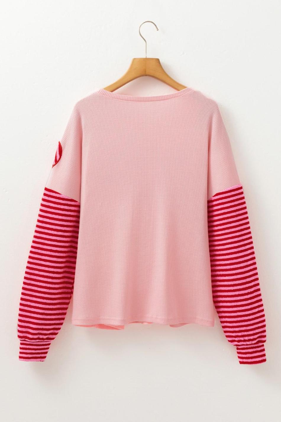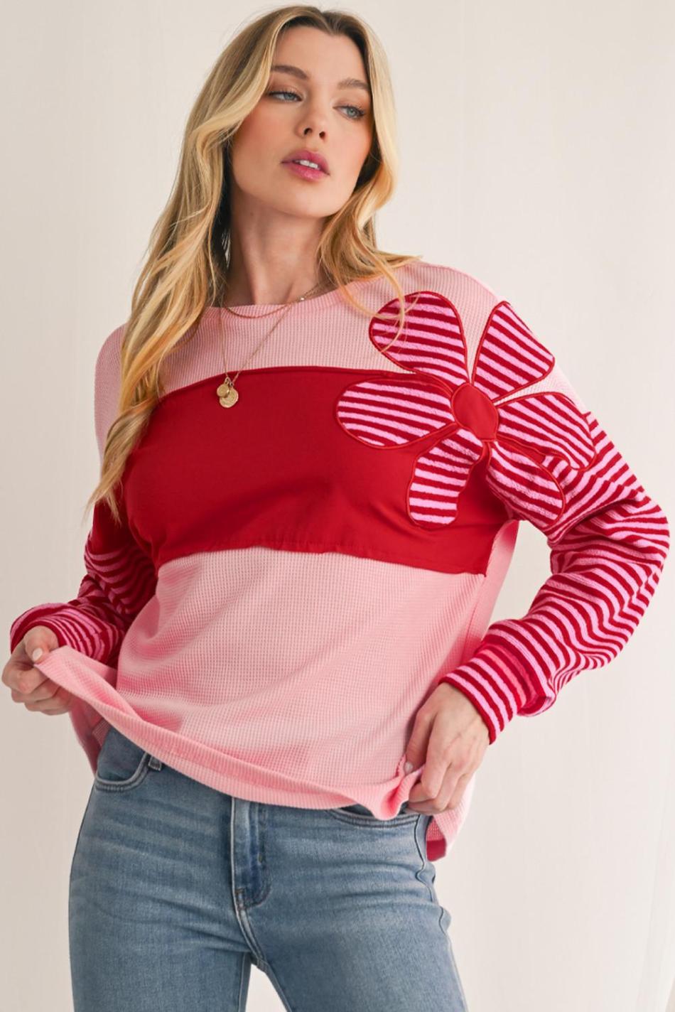 Pink Floral Colorblock Striped Sleeve Waffle Patchwork Top | Women Long Sleeve Tops