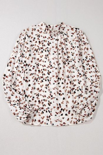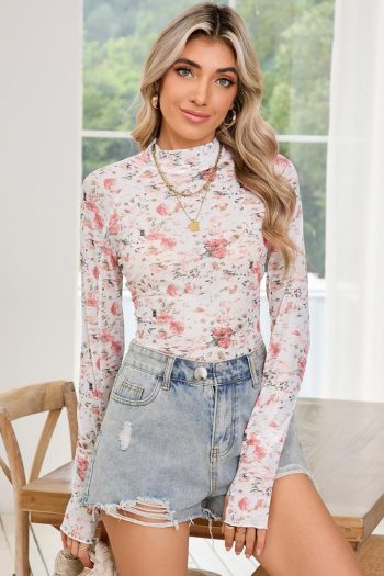 Pink Floral Print Mesh Mock Neck Slim Blouse | Women Long Sleeve Tops