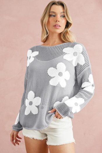 Light Grey 60S Flower Drop Shoulder Hollow Knit Top | Women Knit Tops
